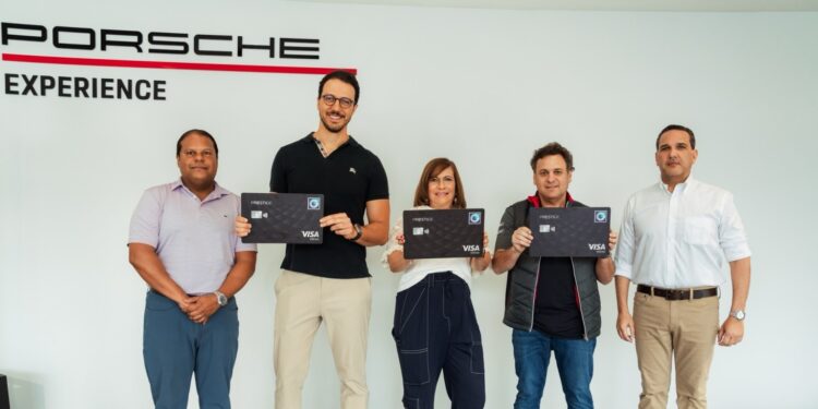 Durante el relanzamiento de la tarjeta, acompañando a los clientes de la entidad financiera, estuvieron los señores Austria Gómez, vicepresidenta del Área de Tarjetas del Banco Popular; Leonte Brea, vicepresidente del Área de Negocios Zona Metro Oeste y Canales Comerciales del Popular; Gustavo Turquía, country manager de Visa; y Jacinto Peynado, CEO de Porsche Center Santo Domingo.