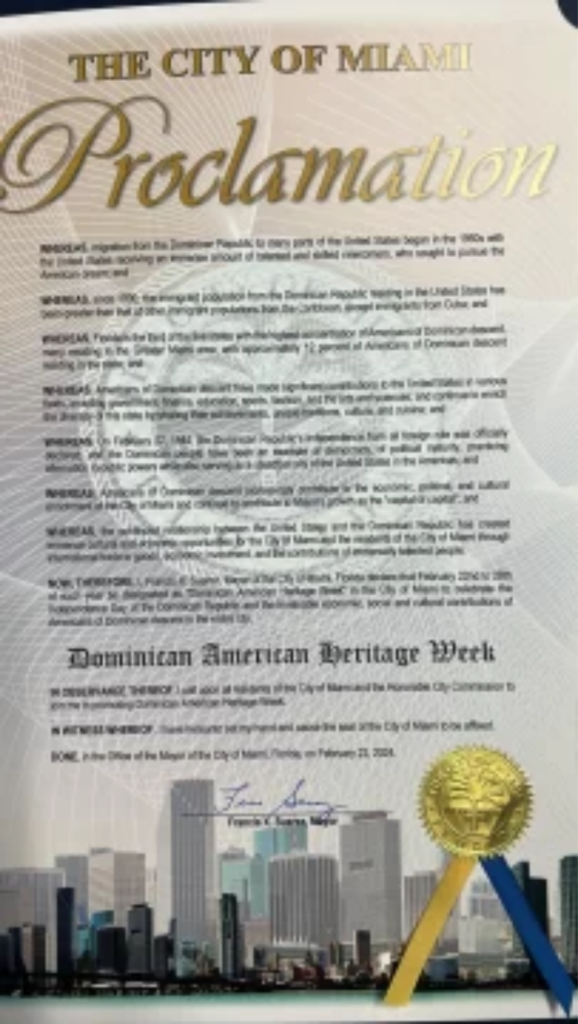 El Consulado General de la República Dominicana en Miami recibió la Proclama por parte de la Alcaldía de Miami, de la “Semana de la Herencia Dominico Americana”, celebrada anualmente desde el 22 al 28 de febrero, en el marco de los festejos del Aniversario de la Independencia del país caribeño.