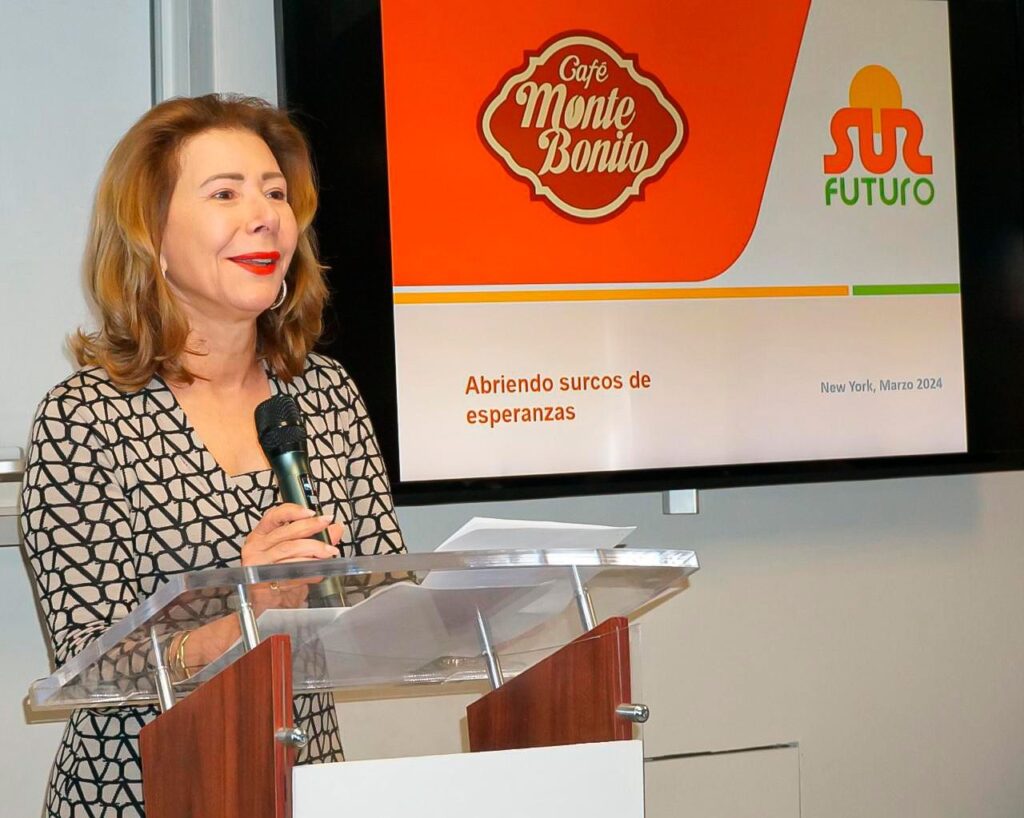 Durante la presentación, Melba Segura de Grullón, presidenta de Sur Futuro, destacó que Café Monte Bonito asegura ingresos dignos para las familias productoras de café y sus comunidades, acompañándoles con asistencia técnica y capacitación a productores y productoras, apoyando su desarrollo, transferencia y adopción tecnológica para el incremento de la productividad; la certificación, promoción y comercialización del Café Monte Bonito convierte el café en una apuesta a la sostenibilidad ambiental, social y económica.