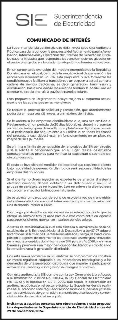 A través del anuncio, la SIE e invitó a la ciudadanía a presentar observaciones sobre el reglamento antes del 29 de noviembre de 2024 en las oficinas de la Superintendencia de Electricidad.
