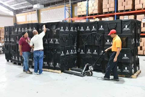 El director nacional de Elecciones de la JCE, Mario Núñez Valdez, informó que los 1,566 kits electorales contienen las boletas para los niveles presidencial y de diputaciones de ultramar, padrones, actas de escrutinio, relaciones de votaciones de contingencia, sellos, chalecos, entre otros, y que esto cubrirá 372 recintos ubicados en las tres circunscripciones del exterior.
