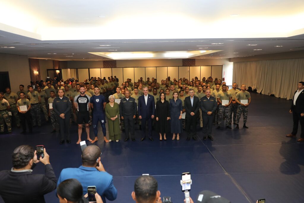 *Santo Domingo. –* El presidente Luis Abinader encabezó este miércoles la clausura oficial del curso Gracie Survival Tactics (GST), en el que participaron 140 integrantes de la Policía Nacional, así como 11 miembros del Ministerio de Defensa y de la Dirección General de Migración, donde también dejó formalmente inaugurado el curso para Instructores de Instructores en el Sistema Táctico Básico Policial, el cual será impartido por la Policía Nacional de Colombia.